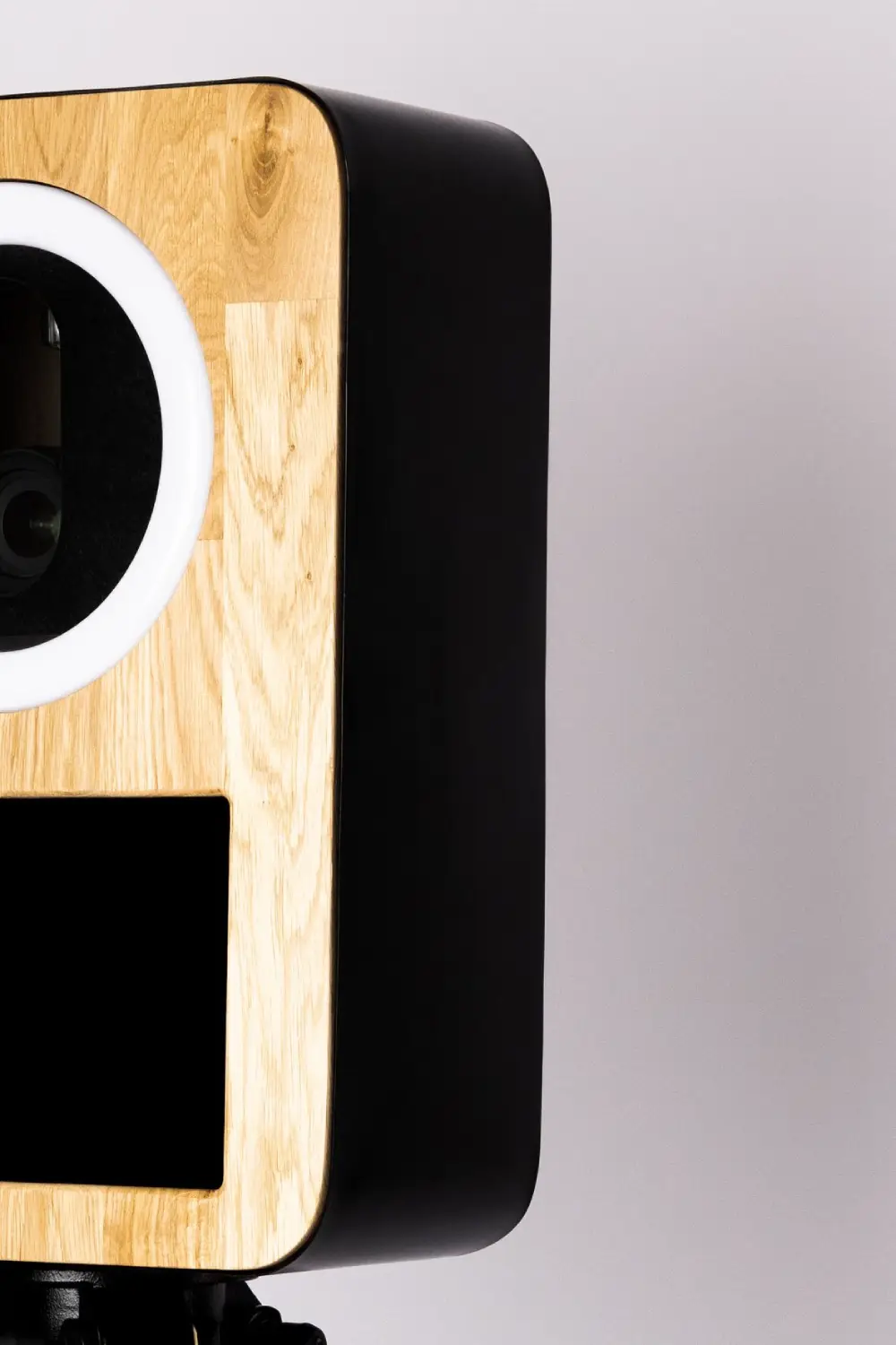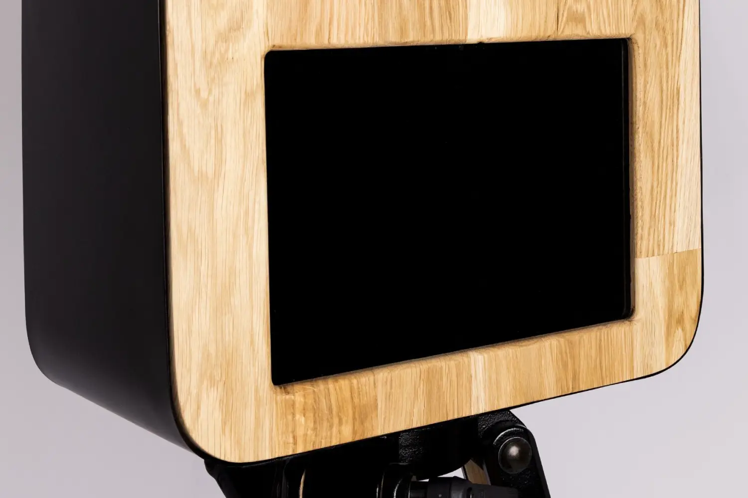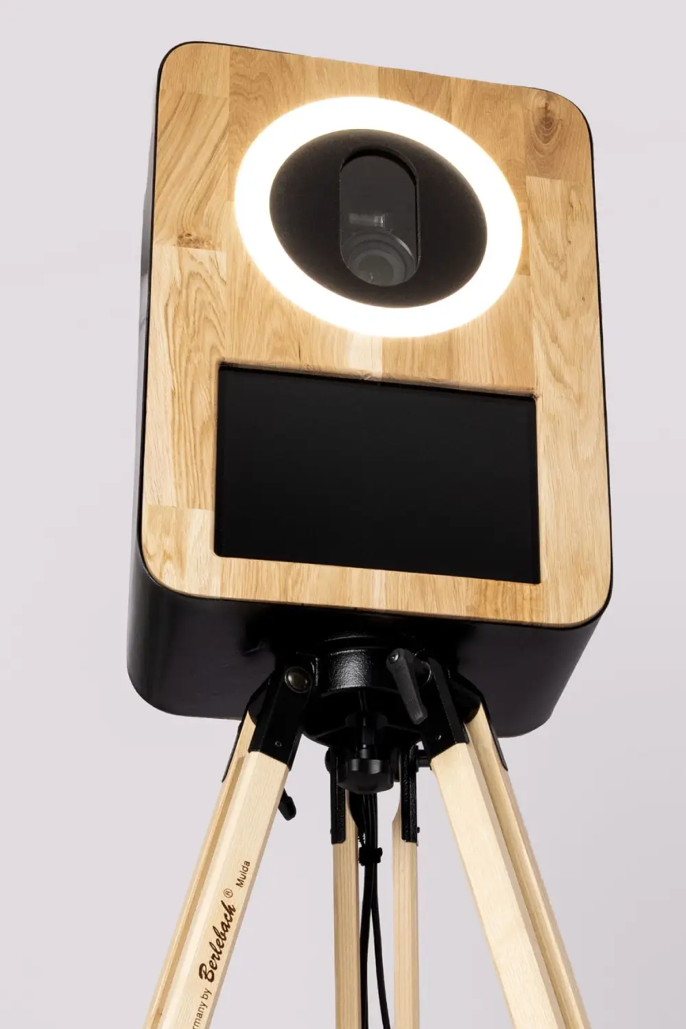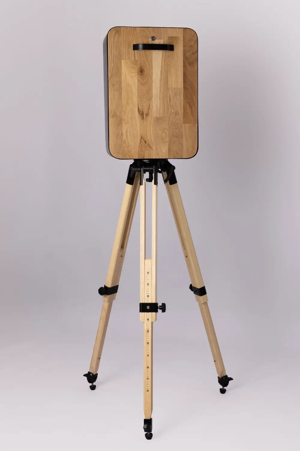Avec sa coque en métal noire et sa façade en chêne massif, la borne photo vous offre un design sobre et élégant. Son robuste trépied en bois permet de garantir une excellente stabilité.